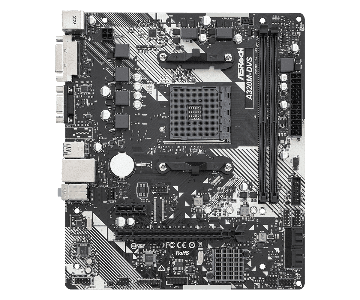 The A320M-DVS R4.0 Motherboard is based on the A320 chipset. Since the motherboard has been updated to the latest BIOS version, it supports AMD AM4 Socket Ryzen™ 5000 desktop processors.